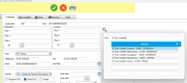 Dans la saisie des adresses, il sera possible d’accéder à une fenêtre de complétion de la rue.